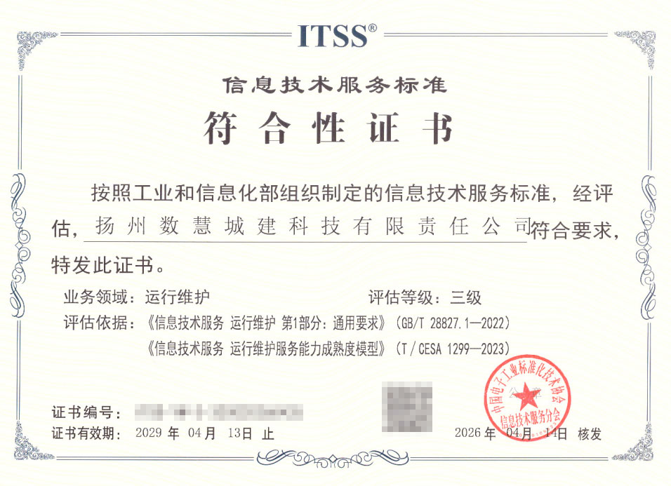 近日,扬州数慧城建科技有限责任公司凭借扎实的技术沉淀、规范的运营管理与专业的服务能力,顺利通过国家级信息技术服务标准(ITSS)的严格审核评估,成功取得ITSS三级资质认证!这一成果标志着公司在信息技术服务标准化、规范化、专业化建设上实现全新突破,迈上新的发展台阶!